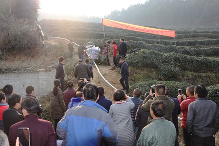 近日,县农机局在白鹤镇石堰茶场举行茶园管理机械化现场观摩活动,向茶叶种植户介绍田园运输机使用技术,现场讲解新机具操作要领。据悉,该机械主要是解决劳动力短缺的问题,从而降低茶厂管护成本。 (代启和 摄)