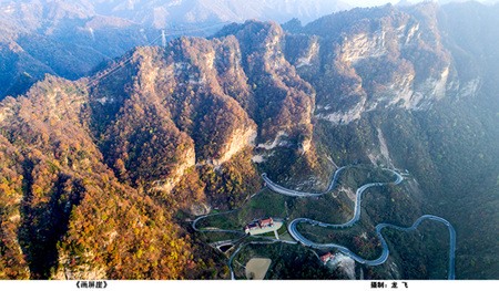 断屏崖相对高度近400米,明显分为上下两层,每层有十多面如刀劈斧削般的崖壁,间布数个水蚀天坑。峭壁千仞,沟壑纵横,古木参天,风景秀丽。全景气势恢弘,小景精致细腻,共同组成长约两公里的绝壁长廊,有如一面横亘在天地之间的绝美画屏。 (龙飞 摄)