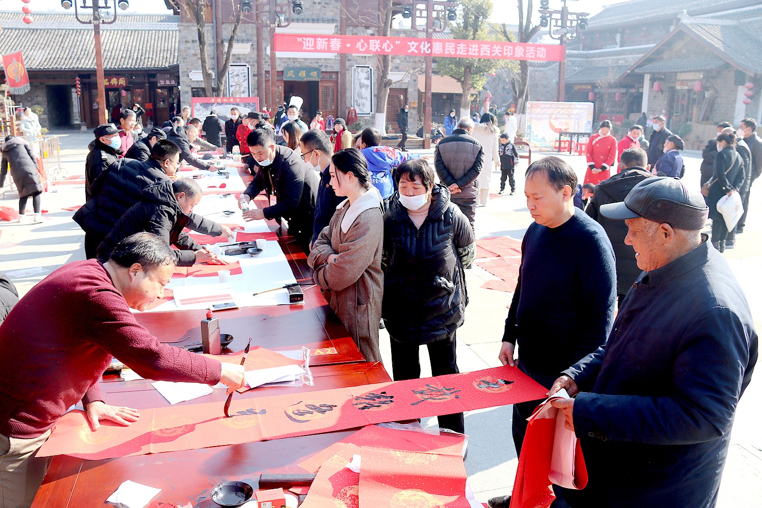 1月1日,县新时代文明实践文化文艺书法家志愿者在西关印象开展“庆元旦·心‘联’心”文化惠民活动,书法家现场挥毫泼墨,为游客及居民群众赠送春联、福字。近年来,我县把楹联文化“七进”作为推进文艺志愿服务的抓手,送对联、送福字己成为文艺志愿服务的常态。(绳晓 董炎林 摄)