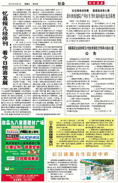 现在,县委、县政府更加重视新闻中心工作,加强了领导力量,增加了采编人员。《今日房县》改为一周三期,新闻报道更加及时,内容更加丰富,特别是实行了期期彩印。这真是房县办报史上的一大创新,一大特色。我坚信,《今日房县》报纸定会办得更加图文并茂,令读者赏心悦目,提神醒脑。我这个“老报人”也必定会更加爱护这份报纸,并将用我手中的这支永不退休的秃笔,经常练笔练脑,做房县报最老的通讯员。