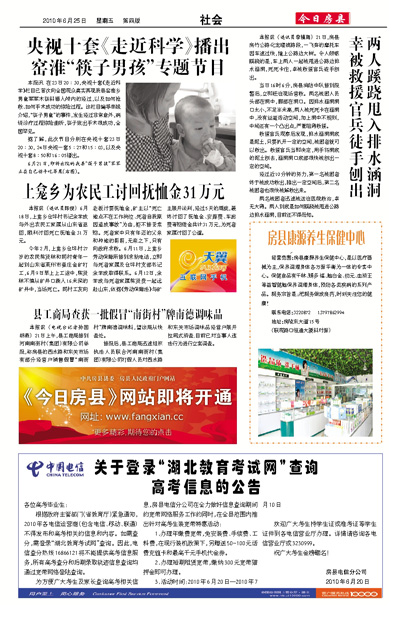 央视十套《走近科学》播出窑淮“筷子男孩”专题节目县工商局查获一批假冒“南街村”牌南德调味品关于登录“湖北教育考试网”查询高考信息的公告上龛乡为农民工讨回抚恤金31万元两人蹊跷甩入排水涵洞图片