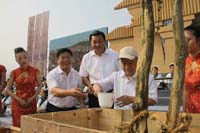 中国诗经学会会长夏传才(右一)、县委书记张歌莺(左二)、县长沈明云(中)一起为象征传承诗经文化的紫薇树培土浇水。