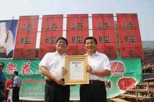 县长沈明云(右)接过上海大世界基尼斯总部现场颁发的万人颂诗经基尼斯纪录证书。
