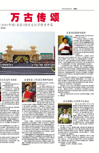 房县作为诗祖尹吉甫故里,在历代典籍中都有明确的记载。《诗经》是中华第一部诗歌总集,在中国文化史上占有重要的地位,在世界上有着广泛的影响。作为诗祖故里,房县十分重视诗经文化这一独特的文化资源优势,提出了打响诗经文化品牌、打造中华诗经城的发展思路,并积极筹办以诗经文化为主题的节会活动,这对于把诗经文化推向全国、推向世界,增强房县的文化内涵、提升房县的文化品位将起到积极的推动作用。我衷心希望通过中国诗经学会·房县诗经文化研讨会暨2010房县诗经文化节的举办,为进一步研究、弘扬诗经文化构筑更加广阔的平台,为房县的发展创造更多的机遇。