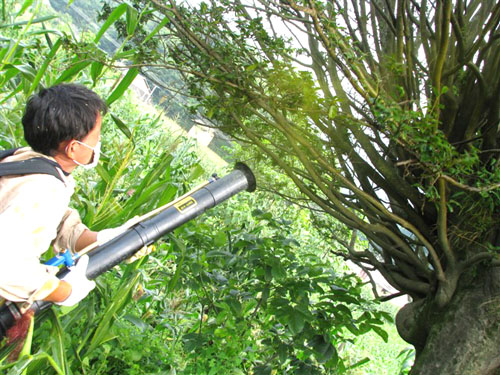 6日,县林业局森防站会同野人谷镇林业站一行4人前往该镇千坪村救治一株患有多种病虫害的古茶树。并对附近农户房前屋后几株患有梨锈病的梨树也进行了防治。图为工作人员在对古茶树进行喷雾治疗。