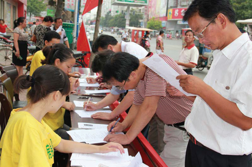从上月初开始,湖北汽车工业学院大二学生汪热带领该院四名在校大学生,在我县进行为期一个月的低碳经济调查。调查期间,四名大学生统一服装,冒着酷暑,深入到部分乡镇、行政事业单位、企业、协会、农户,以交流座谈、调查问卷、咨询服务等方式,对我县的低碳经济情况、目前的状况进行调查。13日,服务团成员走向街头,为广大市民宣传低碳经济知识,发放低碳经济情况调查问卷。图为广大市民接受问卷调查的场景。