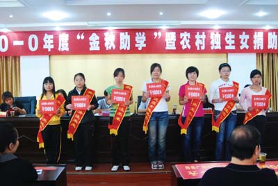 24日,房县2010年度“金秋助学”暨农村独生女捐助仪式在恒通会议中心举行,副县长周登峰出席捐助仪式。本次捐助活动由县总工会与县计生局联合举办,收到各界捐款7万余元,92名困难学子受到资助。