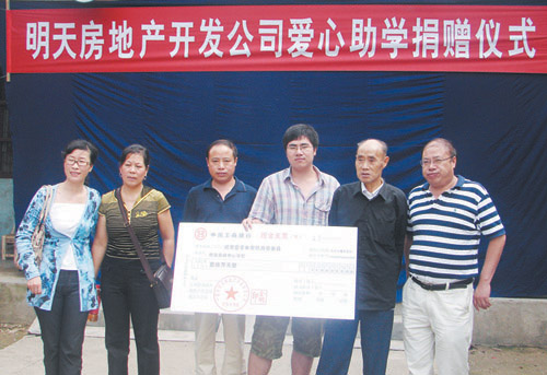 4日上午,青峰镇龙王沟小学欢歌笑语、热闹非凡,一场简朴而热烈的爱心助学捐赠仪式在这里隆重举行。房县青峰籍人士、十堰市明天房地产开发公司总经理金明携家人回到家乡,将10万元现金捐助给龙王沟小学,为学校修建一座图书馆,并许诺待图书馆建成后,还将送来一批儿童图书。县教育局局长李文海,青峰镇党委书记丁杰及龙王沟村部分干部群众和小学全体师生参加捐赠仪式。据了解,近3年来,金明已为家乡累计捐资25万元,用于硬化通村路和修建学校。
