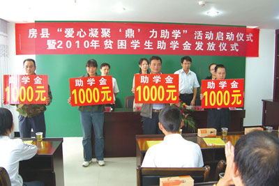 9日,由团县委与中国邮政储蓄银行房县支行联合举办的“爱心凝聚 ‘鼎’力助学”活动正式启动。据悉,该活动将持续到明年8月10日,期间,符合办卡条件的市民每申请办理一张邮储信用卡,邮储银行将替申办者为“邮储银行学子基金”捐赠10元,用于资助我县贫困学生。图为活动启动仪式上,贫困学生家长代表领取助学金。 (田兰兰 摄)