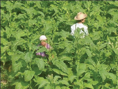 日前,在野人谷镇西坪村烟叶种植基地,两名烟农正在一人多高的烟叶丛中采摘烟叶。今年,野人谷镇烟叶种植面积达2800亩,比去年净增300余亩,预计烟叶总产值可达570万元,烟农可增收230余万元,实现烟叶特产税130余万元。 (陈修权 尤备 摄)