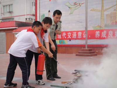 为了进一步教育师生关爱生命,拒绝违章,严防事故,打造平安校园,县实验小学邀请县公安局、县消防大队为实小师生进行交通、消防安全知识讲座。图为学生在进行消防模拟演练。