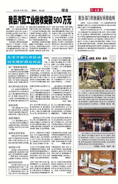 10日,笔者从县经济和信息化局获悉:元至九月份,全县15家汽配企业实现工业总产值1.8亿元,实现产品销售收入1.59亿元,实现税收500万元,分别比上年同期增长85%、95%和60%。