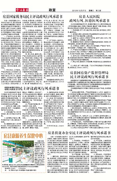 为切实加强房县农行政风行风建设,转变工作作风,提高服务质量、提升行业形象,更好地服务支持县域经济发展。中国农行银行股份有限公司房县支行特向社会作出如下承诺,并诚恳接受社会各界监督。