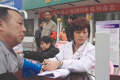 上月28日,县人民医院体检中心主任谢华在县邮政局门口为群众测量血压。通过开展“万名医师支援农村卫生工程”和616对口支援项目,县医院定期组织医务人员在街头进行义诊,派驻对口受援医院,与其保持长期协作关系,提供免费进修,学习机会,开展临床和科研工作,提高农村医疗服务水平。