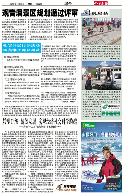 编者按:备受瞩目的十七届五中全会于18日闭幕,全会审议通过了《中共中央关于制定国民经济和社会发展第十二个五年规划的建议》(以下简称“十二五”规划建议)。前不久,我县“十二五”规划编制办公室通过今日房县网向社会全文刊发了《房县国民经济和社会发展“十二五”规划纲要》(征求意见稿),邀请社会各界有志之士积极建言献策、共谋发展。在我县十二五规划即将定稿之际,本报特推出《房县国民经济和社会发展“十二五”规划纲要》(征求意见稿)的系列报道,希望为读者呈现对房县“十二五”相关问题的预测和解读。