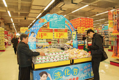 记者日前从寿康永乐生活广场获悉,为回馈广大顾客的支持与喜爱,在冬季来临之际,寿康永乐开展了以‘洗化节’为主题的促销活动,对洗化用品进行了低至七折的优惠,还将享受会员折扣,以及达38元就返利等优惠政策,全面掀起了洗化用品的购买热潮, 为寒冷的冬季增添一丝温暖。图为热卖现场。(闻燃 丰雷 摄)
