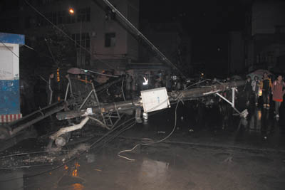 11月27日晚9时许,一辆大货车将东街十字路口(一中岗亭)旁的一根电线杆撞倒后逃逸,被撞倒的线杆连同被拉扯下来的线缆拦在十字路中央,阻塞了来往车辆,致使交通一度陷入瘫痪。相关部门当即组织专人疏导交通,抢修线缆,第二日清晨恢复通行。目前,肇事车辆正在追查中。图为被撞倒的电线杆。