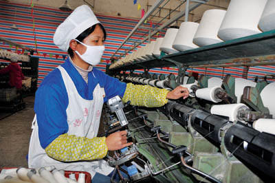 图为房县恒达纺织有限责任公司纺织女工在车间操作的情形。