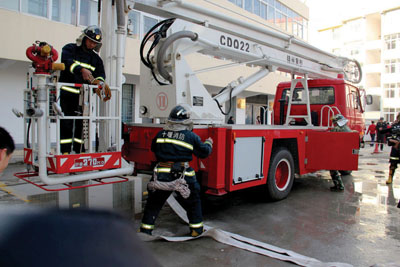 2日,县消防大队在中盛洲际酒店举行高层建筑消防演练。接到救援电话后,县消防大队立即指挥四辆消防车前往救援,分派救援侦查小组对疑似着火楼层进行侦查,并指导人群撤离到安全地带。经侦查,疑似着火楼层6楼有2名人员被困,消防人员根据现场情况,采用高空救援和走消防楼梯两种方式迅速救出两名被困人员,同时采用压制现场火灾态势进行灭火。图为演练现场。 (闻燃 孙飞 摄)