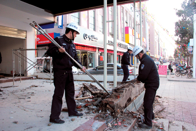 针对我县目前存在部分乱搭乱建、无手续建房以及不符合建筑风格的违章建筑,县城市管理综合执法局按照《中华人民共和国城乡规划法》的相关规定,通过宣传教育,讲清法理、道理和情理,积极争取违规户的配合,对违章建筑依法进行拆除。目前,两户违章建筑已全部拆除,部分正在拆除整改中。图为城管执法人员依法拆除违章建筑。 (刘冲 摄)