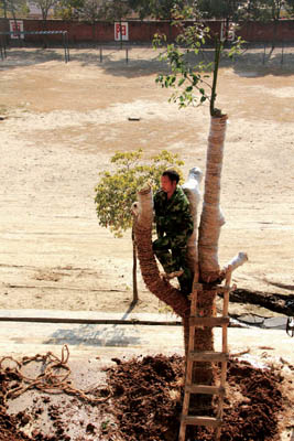 从十一月份以来,全县各乡镇学校、县直各教育单位扎实有效地开展了校园植树绿化暨“大树进校园”活动。活动中,县教育局召开现场会,邀请专家讲授冬季移栽树木的知识。据统计,目前参与冬季绿化植树活动的单位已有21个,参与学校31所,现已栽植树木276棵。图为工人正在为新移栽的树木裹草绑膜。 (田兰兰 刘华山 摄)