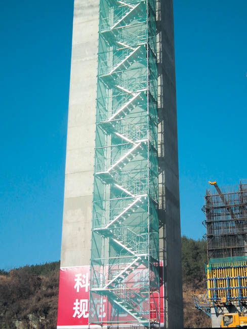19日,笔者在十房高速公路第13合同段施工现场看到,经过施工人员的精心安装和调试,一座安全爬梯正式耸立在十房高速公路第13合同段沙沟河6号桥6号墩右幅墩身旁,从事高墩施工的参建者们正沿着爬梯上下穿梭自如。此举不仅推进了施工进度,同时还为农民工兄弟上下高墩施工系好了“安全带”。(金伟忠 摄)