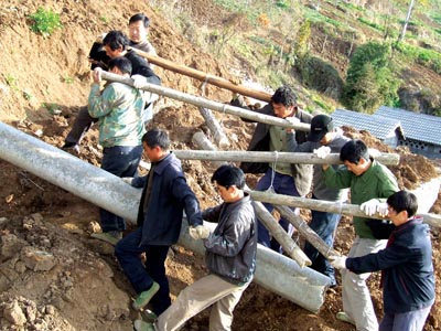 今年来,九道乡集中精力和政策大力推动基础设施建设,目前,投资1930万元的农网改造工程将于近期完工,已建成35KV变电站一座,完成35KV输电线路一条,进村10KV线路5条;新建投资60万元的集镇安全饮水工程一处,维修河堤300米,维修索桥2座,新建瓦房坪村索桥一座。图为该乡组织农民进行农网改造。