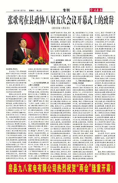 2011年是“十二五”的开局之年。“十二五”期间,我们将以科学发展为主题,以转变经济发展方式为主线,以“发展提速、总量翻番、民生改善、社会和谐、生态优化、环境友好”为目标,大力实施“一圈两带”战略,深入推进“大项目、大招商、大旅游、大交通”,解放思想,顺势而为,努力把房县建设成湖北山区经济强县、全国生态旅游名县。力争到2015年,全县生产总值、固定资产投资突破百亿大关,财政收入达7亿元,社会消费品零售总额达55亿元,工业总产值达150亿元,在全省综合排名进入前40位。实现美好的发展蓝图,需要团结社会各方面的力量,调动一切积极因素,万众一心,克难攻坚,团结奋斗,真抓实干。在这些方面,人民政协责无旁贷。政协组织智力密集、人才荟萃,联系各界、上通下达。政协组织及其委员就是要通过发挥这些优势,做好团结的工作,做好引导的工作,以此统一思想、统一意志、统一步调,形成上下一心、共谋发展的生动局面。特别是“十二五”期间我们面临的十房、谷竹高速公路竣工,十宜铁路的规划、动工,省委、省政府鄂西生态文化旅游圈战略、“竹房百公里城镇带”战略的深入实施,房县进入了项目投资的高峰期、交通瓶颈的突破期、旅游产业的提升期、统筹城乡的推进期、生态建设的关键期。政协组织及其委员要审时度势,准确判断形势、深刻理解县情,始终保持清醒头脑,团结一切推进发展的力量,抓住一切有利于发展的条件,求真务实,扎实工作,在推进发展中做出新的努力、再建新的功业。