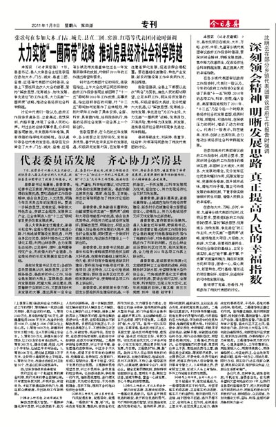 讨论中代表们一致认为,政府工作报告求真务实、立意高远、思想深刻,内涵丰富,体现了全县人民的心声。对过去的总结实事求是,分析问题客观敏锐,未来思路科学准确,具有很强的指导性和战略性。在认真听取各位代表的发言后,张歌莺充分肯定了大木、门古、城关、窑淮、红塔等乡镇及相关县直单位过去一年发展所取得的成就,对做好2011年的工作提出希望和要求。