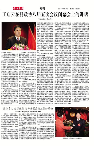 王启云指出,政协房县八届五次会议是在“十二五”开局之时和房县进入黄金发展时期召开的一次重要会议。会上,全体政协委员讨论了房县“十二五”发展规划,同时也讨论了县长沈明云所做的政府工作报告。应该说这次会议是一次振奋精神、鼓舞斗志的会议。面对新的现实,县政协委员要高举团结、民主旗帜,一是多做团结社会各界、统一意志、统一思想的工作;二是凝心聚力、促进发展的工作;三是保和谐,稳定大局,做好创优房县发展环境的工作。