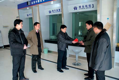 2月3日,农历正月初一一大早,县联社班子成员便深入到各营业网点,看望慰问在节日期间坚守在岗位上的一线员工,给他们拜年并致以节日的问候。据了解,为方便广大群众在春节期间能够正常办理业务,县联社对各网点节日期间的上班时间和人员进行了统筹安排,从正月初一便开始上班营业。图为联社领导向一线员工发“红包”时的情景。 (戢浩 摄)