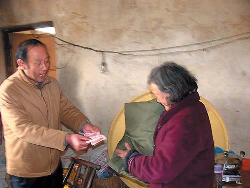 日前,县畜牧兽医局一行五人来到白鹤镇黄杨村,在镇领导的陪同下开展了春节慰问困难户送温暖活动,走访了老党员和困难家庭10余户,为他们送去了一些粮油等食品和3.26万元帮扶慰问金,并向他们祝以新春的美好祝福。图为该局局长赵开敬为困难群众送上慰问金。 (宋俊敏 摄)