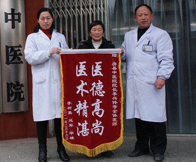 17日,70多岁的病人李树英将一面绣着“医德高尚、医术精湛”的锦旗送到县中医院心脑血管科主任张玉清的手中,感谢该科室全体医护人员精湛的医术和贴心的护理。今年以来,该院已经收到感谢信17封,锦旗6面。