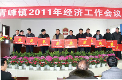 在21日召开的青峰镇经济工作会上, 11 名特色产业专业村的负责人和20多名产业大户代表走上主席台接受颁奖。为表彰在2010年度中发展经济做出贡献的先进单位和个人,青峰镇政府拿出25万元重奖特色产业专业村和产业大户。