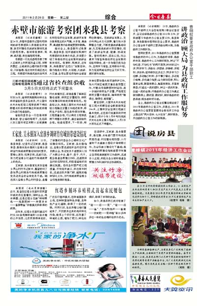 座谈会上,县委副书记张慧彬,县委常委、组织部部长陈渊对考察团的到来表示欢迎,并简要介绍了房县经济社会发展和旅游业有关情况。张慧彬、陈渊说,近年来,房县围绕“五四三”发展目标,强力推进大项目、大招商、大旅游、大交通,各项主要经济指标全部呈两位数增长。在旅游业发展上,充分利用山水文化资源,着力加大资源整合力度,不断完善旅游基础设施,扎实推进旅游大项目建设,促进了旅游业快速、健康、协调发展。曾向阳表示,回去以后,将认真学习借鉴房县经济社会发展的经验和做法,进一步加强交流与合作,互相学习借鉴,互相取长补短,努力促进两地经济社会又好又快、更好更快发展。