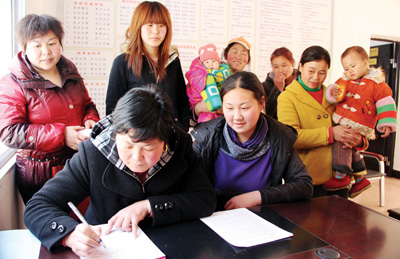 春节过后,外出务工的人员越来越多,为扎实做好流动人口的计划生育工作,五台山林业总场抢抓时间,与育龄妇女签订优质服务、村民自治、流动人口管理合同书,明确她们在计划生育方面可以享受的权利和应承担的责任。图为该场廖家河村计生专干(左二)正在与本村育龄妇女签订合同。