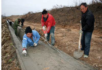 为确保春耕生产不误农时,开春以来,我县对汪家河、关门山和吴杏三大万亩灌区,新建、配套节水主干和进田农渠。目前,完成汪家河万亩灌区改造,其它两大灌区水利设施配套在4月以前完成,工程全部投入使用后,预计今年农作物增产效益920余万元,减少水耗464万立方。图为工程队正在抓紧建设红塔高碑高效节水渠道。(张启龙 段东 摄)