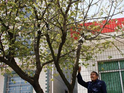9日,笔者在军店镇黑獐沟村农民张承新家发现,他家门口的一棵樱桃树,左侧树枝已结出黄豆粒大的樱桃,右侧树枝却正盛开白色花朵。当地老人介绍说,这棵樱桃树挂果两种樱桃,左侧树枝先开花,挂果小樱桃,而右侧树枝后开花,结出的是大樱桃。一棵树结大、小两种樱桃实属罕见。(张启龙 刘双 摄)
