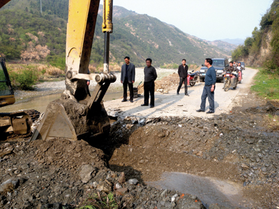 14日中午,中坝乡龙驹沟电站门前路段一派繁忙景象。据了解,从此处通行的村民及车辆时常因水淹路面而深受出行不便的困扰。在接到村民信访要求后,乡党委政府立刻与龙驹沟电站及三池电站相关负责人进行磋商,积极筹措资金对该路段进行修整。目前,该工程正在紧张施工中。 (赵晓双 摄)