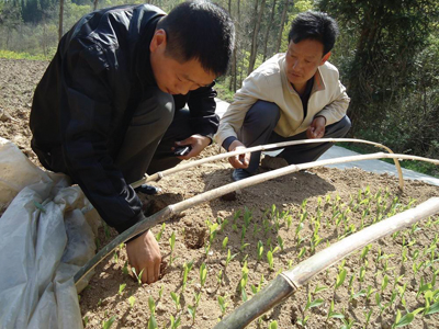 今春以来,土城镇加大糯玉米种植力度,武汉海丰食品加工有限公司与该镇种植户签订糯玉米生产回收协议,并派专业技术人员到育苗基地指导营养钵育苗。图为技术人员在检查玉米营养钵生长情况。(邓丽君 吴晓冰 摄)