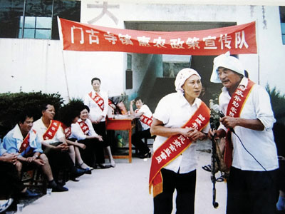 5日,门古寺镇财政所干部正在高塘河村为村民表演夫妻对唱“惠农政策就是好”。为使广大群众深入了解惠农政策,从年初开始,门古寺镇政府组织财政、文化站等单位的职工组成文艺宣传队,以“落实强农惠农政策、促进农村和谐发展”为主题,将“惠农工程”编成三句半、小品、表演唱等形式巡回各村进行文艺演出,受到了干部群众的好评。 (张艺曼 陈晓梅 摄)