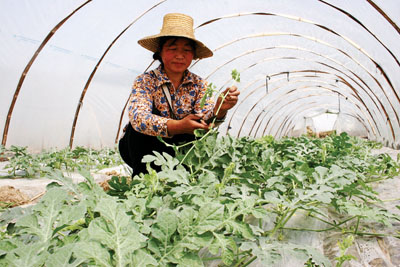 4日,县旱粮场农民郑旭莲在打枝西瓜苗。农家妇女郑旭莲利用当地土地资源优势,从新疆引种高产优质西瓜,发展大棚104个,引种新疆西瓜120亩。今年见效后,实现收入达180余万元。 (张启龙 段东 摄)