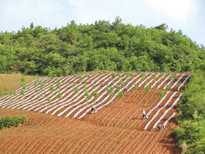 10日,门古寺镇境内普降中雨,该镇党委、政府迅速组织镇村干部深入田间地头,发动群众抢抓墒情,进行烟覆膜、烟苗假植保栽工作。目前,89名镇村干部与300余名群众正在3500亩烟地上合力打响抢墒覆膜保栽攻坚战。图为该镇项家河村村民抢抓墒情,进行烟地覆膜。(吴莹莹 摄)