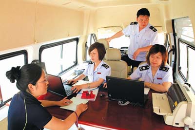 9日上午9时,县地税局“流动办税服务车”在军店镇通过无线网络为“兄弟超市”成功开出了第一张税票,这标志着由省局配发的流动纳税服务车正式投入运行,将集远程纳税服务、税法宣传于一体,纳税人能到办税厅办理的业务,在流动办税服务车上全部办结,解决了边远乡镇的纳税人“办税难、领用发票难”的问题。