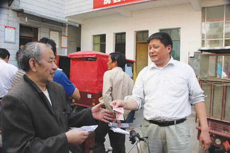 图为县残联理事长散启先亲手将燃油补贴发放到残疾人手中。