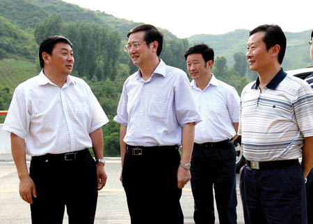 省旅游局局长张达华(中)在县领导沈明云(左一)、姚天国(右一)的陪同下察看野人谷景区