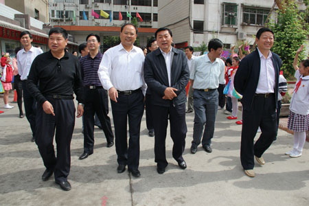 图为县长沈明云(右三)带领四大家领导在县实验小学调研