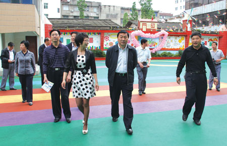 县长沈明云(中)带领县四大家领导在县幼儿园视察。