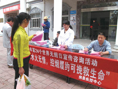 5月31日,县疾病预防控制中心组织有关专业人员,在县城东城门路滨河花园路段开展了第24个“世界无烟日”主题宣传活动。此次宣传现场悬挂横幅1条、张贴“全省医疗机构禁烟宣传画”1张、印制控烟宣传材料2种,累计发放450余份,现场接受有关戒烟问题的咨询近30人次。(邓发基 摄)