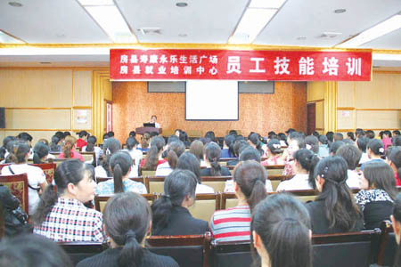 为给顾客提供舒适满意的服务环境,提高员工的职业道德风范,1日,县寿康永乐生活广场、县就业局在中盛洲际大酒店会议中心联合对寿康永乐房县区域的千名员工进行技能培训,此次培训为期两天,内容包括员工的言谈举止、工作纪律等日常行为和各岗位的操作要点。图为培训现场。 (闻燃 王丽君 摄)